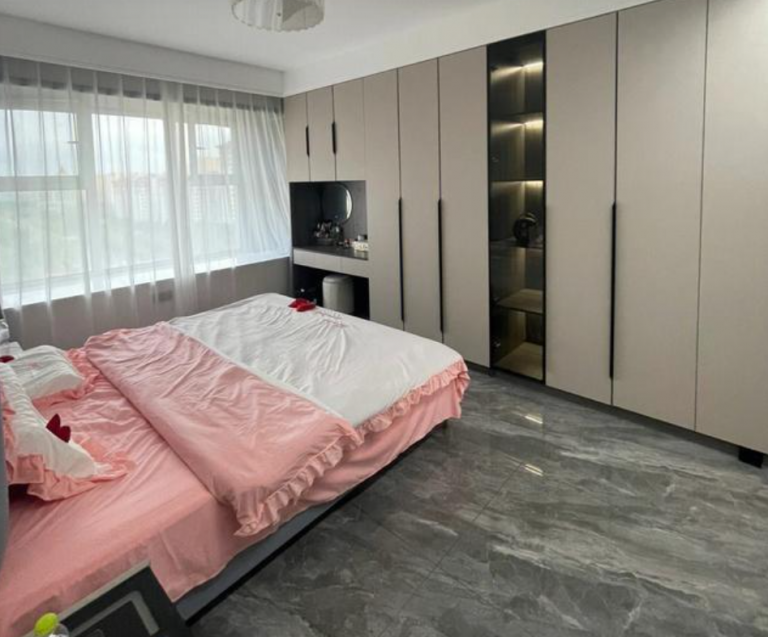 這是主臥,床尾對面的墻體設(shè)計的衣柜直接到頂,半點空間都沒有浪費。設(shè)計柜子的時候,旁邊預(yù)留了梳妝臺的位置,可以非常方便女屋主使用,大小位置合適。全屋地面選擇選擇鋪貼灰塵瓷磚,非常耐臟。